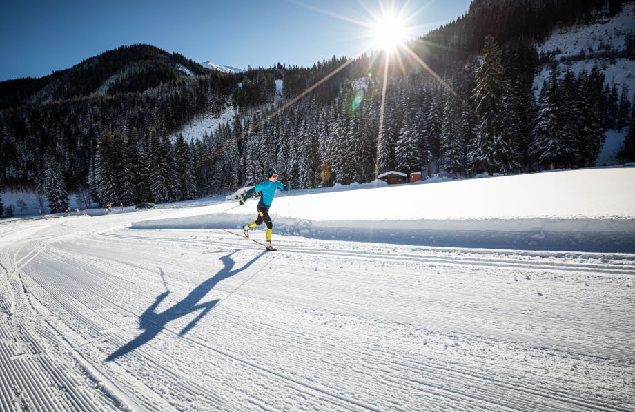 Langläufer genießen in Saalbach-Hinterglemm eine kleine, aber feine Auswahl an traumhaften Loipen mit herrlichem Bergpanorama. Besonders beliebt ist die rund 10 Kilometer lange Talschlussloipe in Hinterglemm, die klassisch und für Skating gespurt ist. Sie verläuft auf flachem, sonnigem Terrain entlang der Saalach bis in den idyllischen Talschluss – ideal für Genießer und Einsteiger.