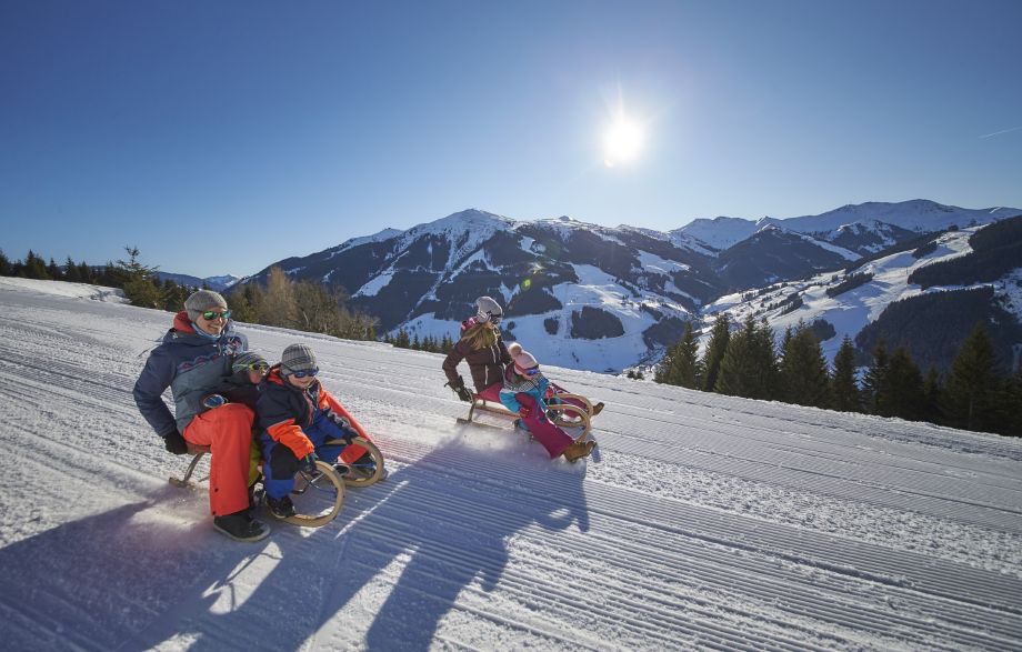 Auch am Spielberghaus in Saalbach erwartet Familien eine weitere, stimmungsvolle Naturrodelbahn mit gemütlicher Einkehrmöglichkeit. Rodel können direkt vor Ort ausgeliehen werden – so steht einem vergnüglichen Wintertag im Salzburger Land nichts mehr im Weg.