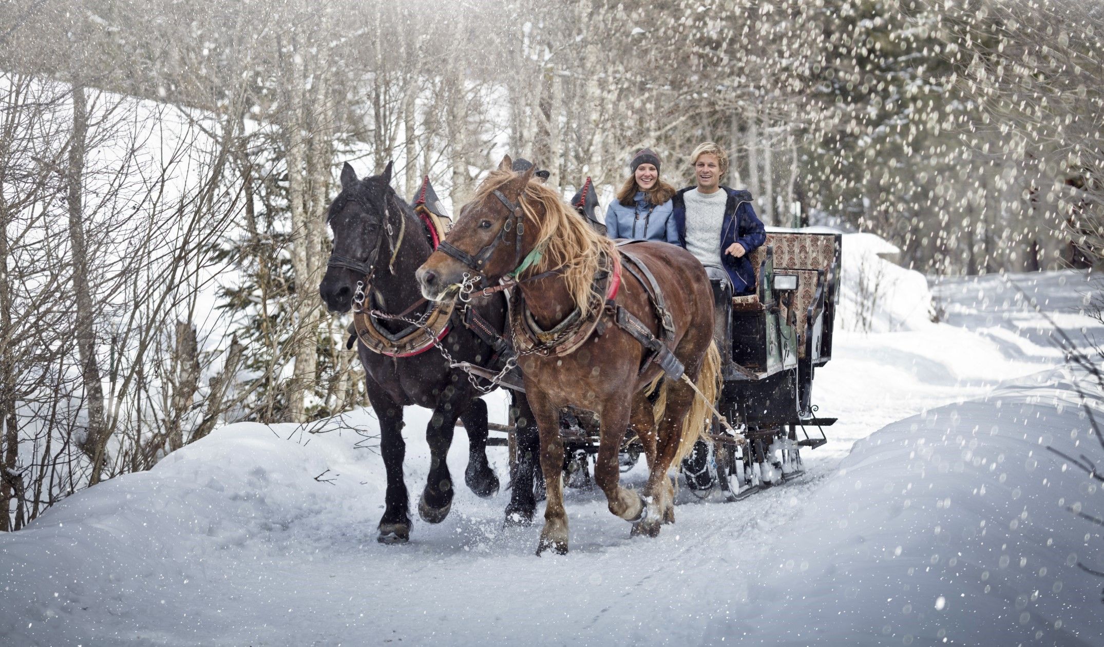 Pferdeschlittenfahrten: Eingehüllt in warme Decken gleiten Sie lautlos durch die verschneite Landschaft – ein unvergessliches Erlebnis für Paare und Familien.